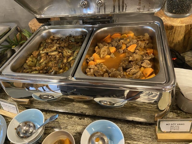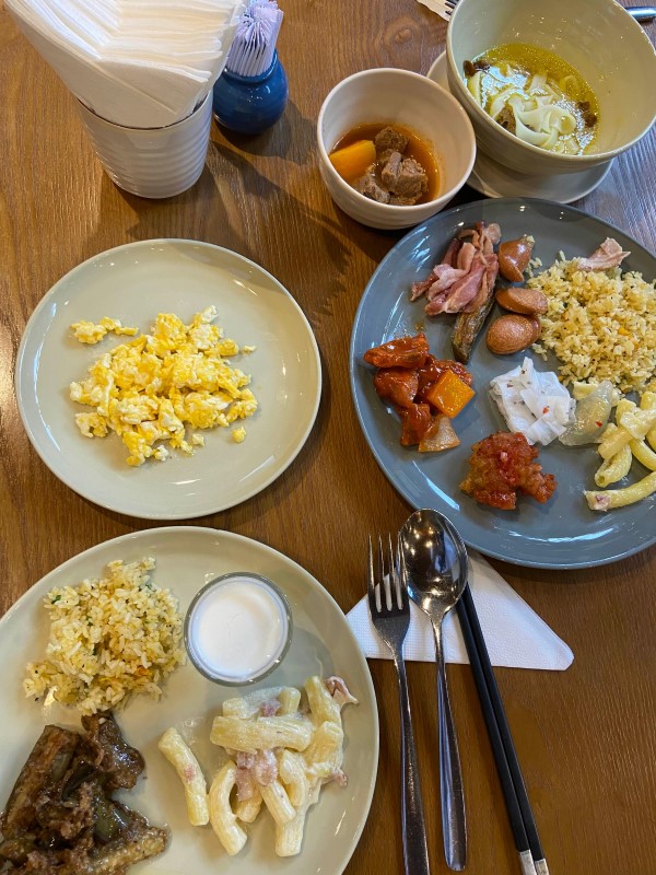 또한, 치하우스에서는 조식을 제공하여 아침부터 든든하게 시작할 수 있다. 조식은 뷔페 스타일로 나오는데 베트남식의 밥과 쌀국수뿐만 아니라 양식도 적절히 섞여 있어서 취향에 맞게 골라 먹을 수 있다. 처음 보는 떡과 빵 종류도 있었고, 신선한 채소와 열대 과일 몇 가지가 제공되었다. 우리가 먹은 날은 치킨 육수로 된 쌀국수가 나왔고, 계란을 주문하면 스크램블 에그, 오믈렛 등 원하는 형태로 즉석 조리해 준다. 치하우스의 조식 운영시간은 오전 6:30부터 오전 9:30까지이다.