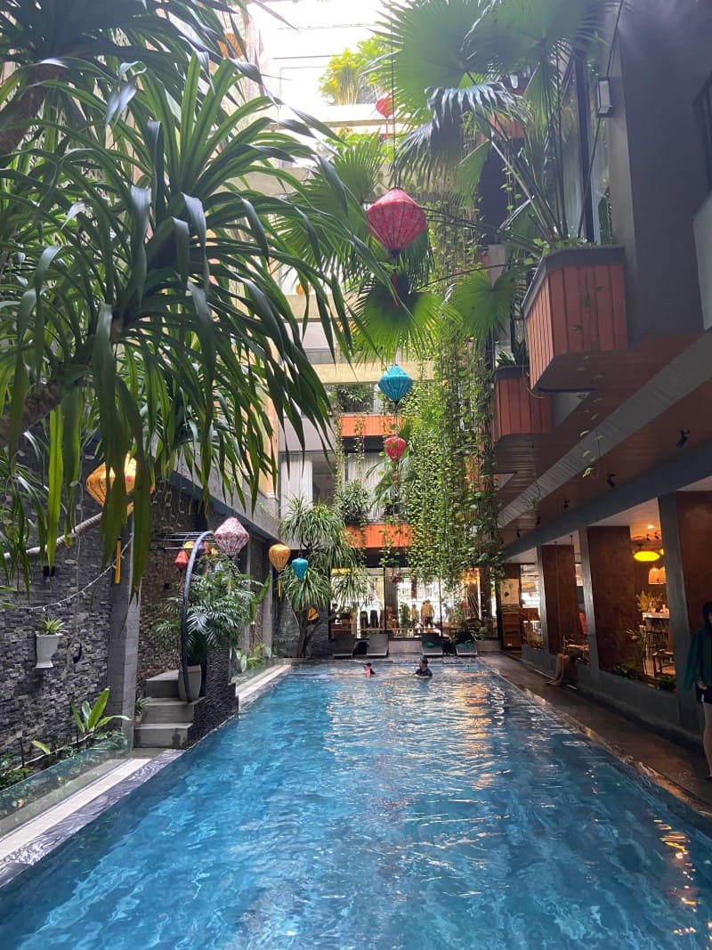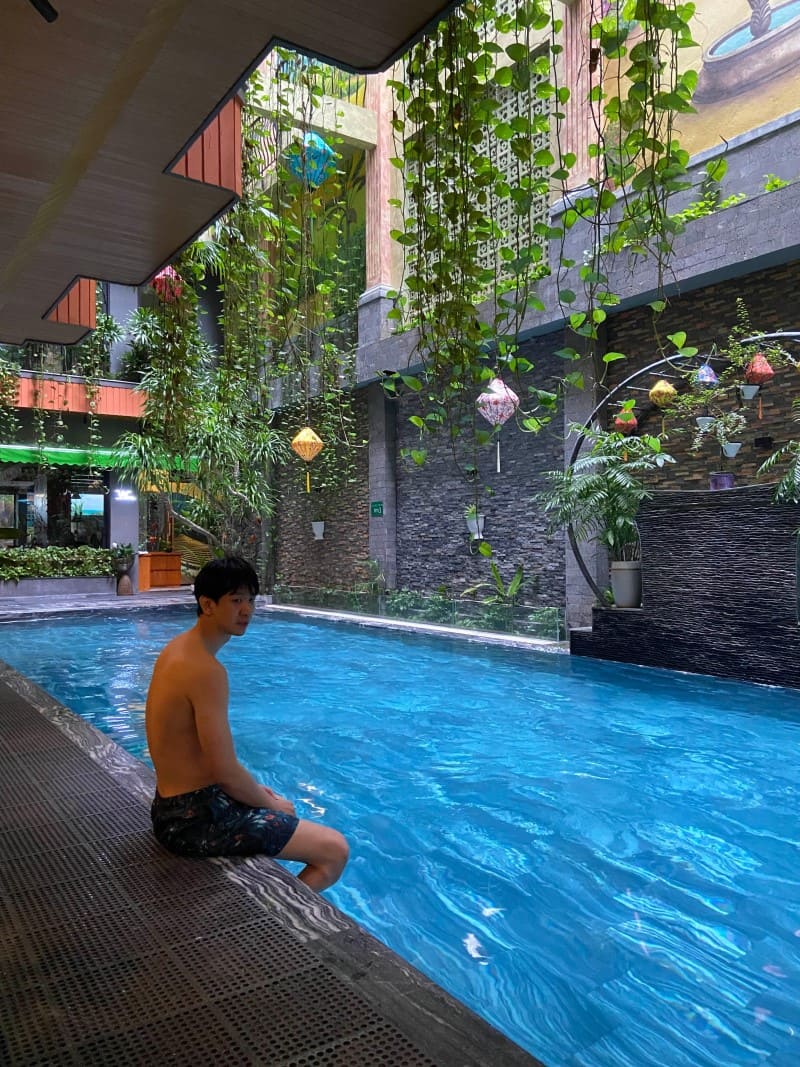 다낭 치하우스의 가장 큰 장점은 단연 수영장이다. 단순한 숙소의 부대시설이 아니라 핵심이라 해도 과언이 아니다. 건물 중앙에 자리 잡은 치하우스의 수영장은 푸른 타일과 열대 식물들로 이국적인 분위기를 자아낸다. 보자마자 너무 예뻐서 감탄이 터져 나온다. 다낭의 번잡한 도심과는 또 다른 풍경이 펼쳐지고 그야말로 '휴양지' 느낌이 물씬 풍긴다.